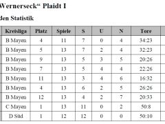 Ärgerlich aus Sicht der ersten Mannschaft war der Spielabbruch wegen Nebel am Samstag. Hätte das zwischenzeitliche 4:1 gegen Miesenheim II auch am Ende bestand gehabt (Neuansetzung 28.11.2018), wäre dies die beste Hinrunde der jüngeren B-Klassen-Geschichte gewesen. Mehr Treffer (34) nach 11 Saisonspielen sind den Plaidtern noch nie gelungen. Dabei sticht das Offensive-Trio um den angeschlagenen Spielführer Dominik Mürtz (9 Tore), Youngster Tom Engels (8) sowie Flügelflitzer Martin Paffhausen (7) besonders heraus. Beeindruckend waren die deutlichen Heimsiege gegen Baar (3:0) und Langenfeld (4:0). Dagegen schmerzten die Derbyniederlagen gegen den FC Plaidt II (3:4) und den SCC Saffig (2:0) umso mehr. Die guten Leistungen in den übrigen Partien lassen die Adler-Fans dennoch positiv in die Zukunft blicken.