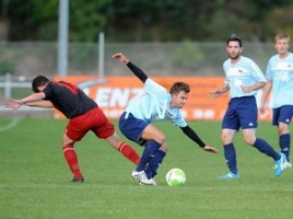 29.09.2012: DJK Plaidt gg. FSG Lasserg. Andi Samson (am Ball) wird von Lukas Wilhelmy und Steven Lehmann (von rechts) beobachtet. Foto: Andreas Walz