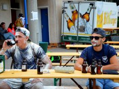 Kevin Neumann (links): „Ich erinnere mich ganz genau an diesen Tag, da haben wir uns ordentlich die Maschinen geölt (lacht). Ich glaube, ich musste damals zusammen mit der Wildsau (Jens Schommer, Anm.d.Verf.) beim Mehlschneiden am Sauerwasser gegen zwei andere Schluckspechte aus der Mannschaft antreten (wenn ich mich recht entsinne Andi und Simon). Da der Enf (Jens Schommer, Anm.d.Verf.) aber immer so eine zittrige Hand von seinen ganzen “Softdrinks“ beim Darttraining hat, haben wir natürlich verloren. Danach durften die Jungs dann unsere Gesichter einmal im Mehl parken, herrlich. Ich warte bis heute sehnsüchtig auf eine Revanche.“