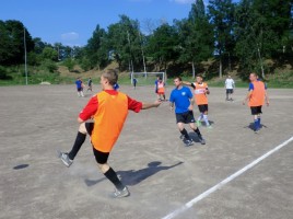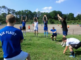 Zum Foto: Um die gesteckten Ziele zu erreichen werden sich die Jungs mächtig strecken müssen. Beim Saisonauftakt gab es ein lockeres Turnier mit drei Mannschaften. Das pausierende Team wurde von Markus Umbscheiden bei Kraftübungen gefordert und kam mächtig ins Schwitzen.