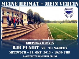 Am Mittwochabend (23.10.) trifft die erste Mannschaft der DJK Plaidt (6.) auf den Aufsteiger TG Jahn Namedy (13.). Das Nachholspiel in der Kreisliga B Mayen wird um 19:30 Uhr von Timo Rose angepfiffen. Mit einem Sieg können sich die Gastgeber bis auf den vierten Rang vorschieben. Die „Adler“ sollten sich von ihrem aktuellen Höhenflug jedoch nicht blenden lassen, immerhin beträgt der Abstand zur Abstiegszone nur vier Pünktchen.