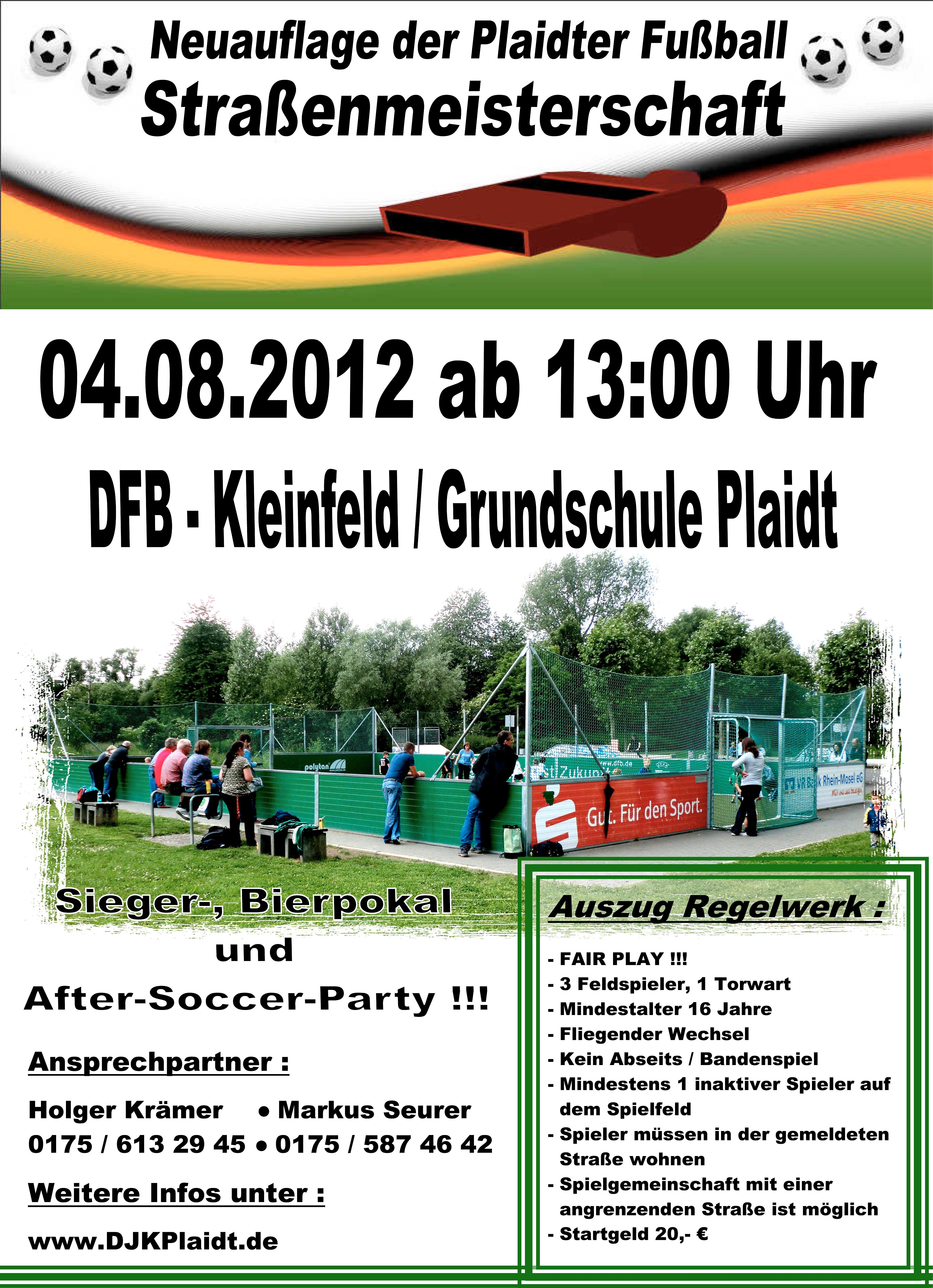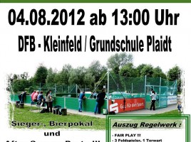 Plaidt. Am Samstag, dem 04. August 2012 fand eine Neuauflage der Plaidter Straßenmeisterschaft im Fußball statt. Acht Teams traten im Wettkampf gegeneinander an, um den Straßenmeister 2012 zu ermitteln. Die Spiele wurden auf dem DFB-Feld hinter der Grundschule in Plaidt ausgetragen und zahlreiche Fußballfans, Spaziergänger und Familien mit ihren Kindern wollten sich das Spektakel nicht entgehen lassen. In der Auftaktpartie verlor das Team „Auf der Esch“ knapp mit 2:1 gegen den späteren Finalisten „Miesenheimer/Ringstraße“. Natürlich wollte sich keine Mannschaft unter Wert verkaufen und so gab es spannende Spiele und zahlreiche Tore zu bestaunen. In 28 Partien fielen unglaubliche 178 Treffer, was natürlich auch am kleinen Spielfeld und an der rundum Bande lag, die keine langen Verschnaufpausen zuließ. Das vielleicht schönste Tor des Tages erzielte Klaus Rollmann mit einem gefühlvollen Heber von der Mittellinie über den verdutzten Torwart. Am Ende landete er mit seiner Nachbarschaft „Im Maschereg“ auf dem dritten Platz. Respekt verschaffte sich vor allem die „Hummerich/Eifelstraße“ mit einem Gesamtalter von 216 Jahren (bei 5 Spielern), es reichte jedoch nicht ganz für den Einzug ins Halbfinale. Das Finale endete mit 4:3 zwischen dem „Sonnenhof/Sonnenland“ und der „Miesenheimer/Ringstraße“. Somit gewann die Kombination „Sonnenhof/Sonnenland“ den Siegerpokal und darf sich nun offizieller Fußball-Straßenmeister-2012 nennen. Noch intensiver wurde nur der Bierpokal von den „Auf der Esch – Streetfighters“ gefeiert, welche sich diesen Preis redlich verdient hatten. Die Veranstalter hoffen auch im nächsten Jahr wieder auf viel Zuspruch und einige Mannschaftsmeldungen, damit es dann wieder heißt „Wir sind ein Dorf… und das ist meine Straße.“