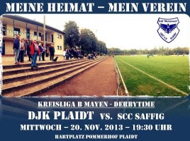In der vergangenen Spielzeit trafen die Teams zweimal aufeinander (Kreisliga B Mayen). Beide Spiele fanden im Jahr 2012 statt. Im Hinspiel (29.08.2012) siegte die DJK am Pommerhof mit 3:1. Die Torfolge: 1:0 Peter Sachse 24., 2:0 Denis Astor 37., 2:1 Kai Wagner 45., 3:1 Sachse 57. Das Rückspiel entschied der SCC in Saffig mit 3:0 für sich. Torfolge: 1:0 Christian Kluck (3. FE), 2:0 Noel Morales (57.), 3:0 Andre Altenberg (60.).