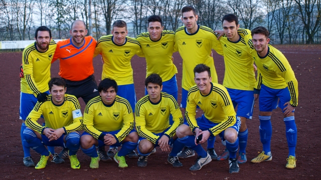Kader der DJK Plaidt – Foto, hintere Reihe von links: Steven Lehmann, Andreas Kuhlen (TW), Martin Paffhausen, Kevin Neumann, Lars Angemeer, Simon Schmitt, Andi Samson. Vordere Reihe von links: Daniel Raasch (Cpt.), Peter Sachse, Tim Büchel, Dominik Mürtz. Ersatzbank: Marlon Schumacher, Mohammad Ghafouri, Jan Angemeer, Dominic Kohnz.