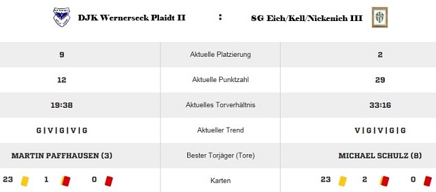 Der Aufwärtstrend bei der Adler-Zwoten ist unverkennbar. In bisher drei Spielen nach der Winterpause gelangen den Plaidtern zwei Siegen bei einer knappen Niederlage. Zum Vergleich: In den 11 Spielen zuvor gab es nur einen Erfolg (0:1 in Kottenheim) und 7 Begegnungen gingen verloren. Dazu zählte allerdings nicht die Hinspiel-Partie gegen den kommenden Gegner, die SG Eich/Kell/Nickenich III. Ralf Gräf bescherte seinem Team, am 01. Oktober 2014 auf dem Hartplatz in Nickenich, mit einem Last-Minute-Treffer einen Punkt (2:2 – 88. Minute).