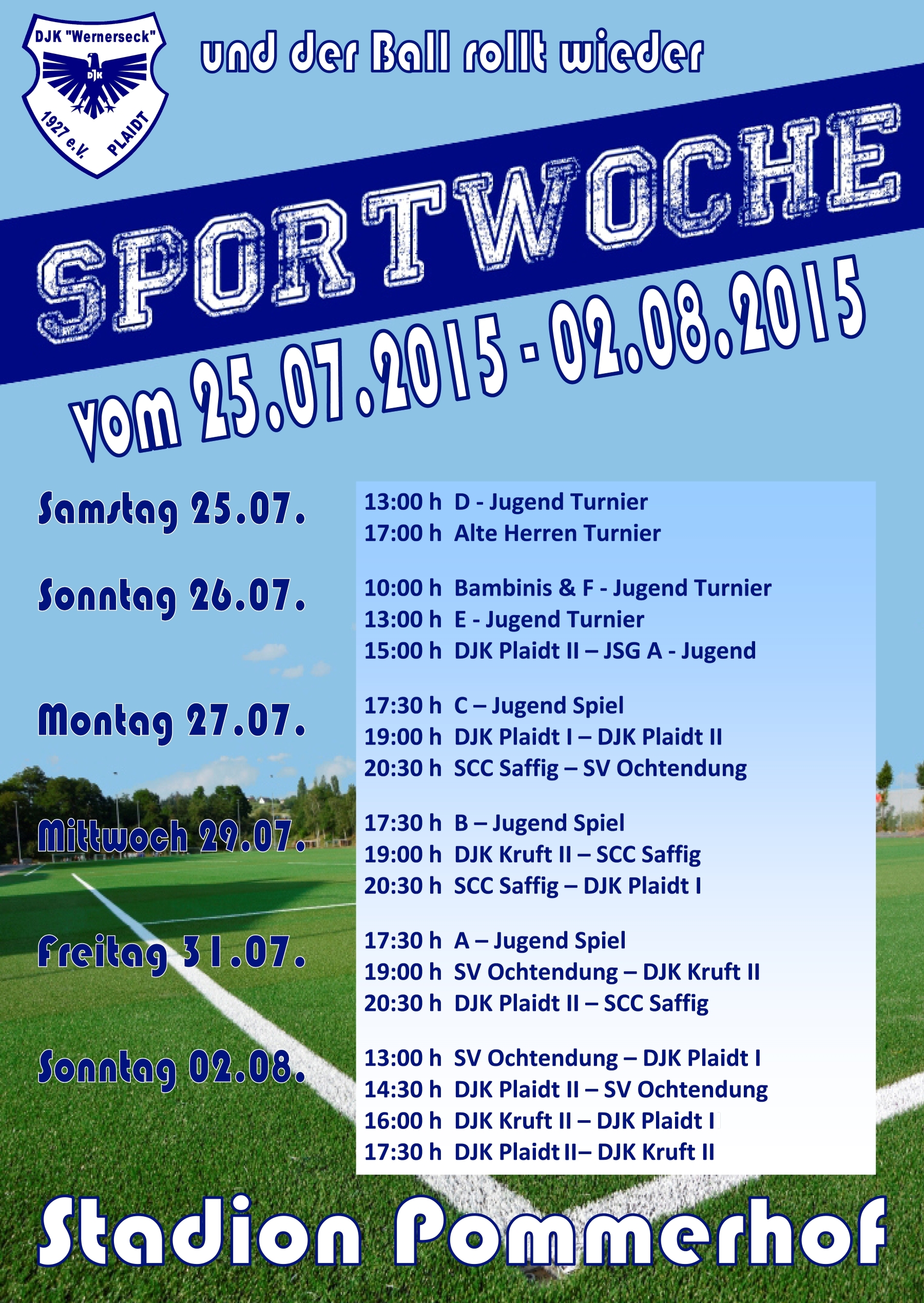 In diesem Sommer wurde der Rasenplatz am Plaidter Pommerhof zu einem Kunstrasenplatz umgebaut. Anlässlich der Erneuerung der Anlage wird die Fußballabteilung der DJK Wernerseck Plaidt ihre Sportwoche wieder aufleben lassen und lädt dazu herzlich vom 25.07. bis zum 02.08.2015 nach Plaidt ein.