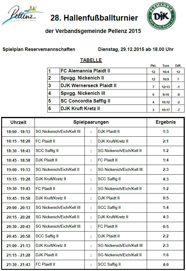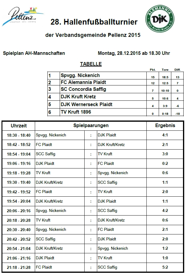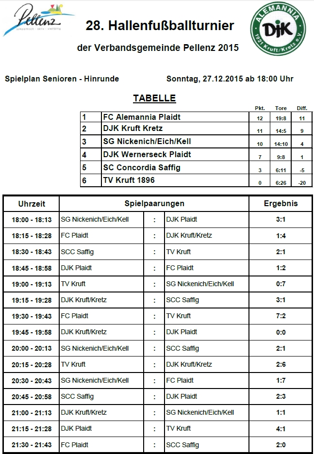 Am Sonntag, 27. Dezember, startet die 28. Auflage des Hallenfußballturniers der Verbandsgemeinde Pellenz in Plaidt. An vier aufeinanderfolgenden Tagen messen sich die Vereine der Pellenz in den Altersklassen von den Bambini bis hin zu den Alten Herren. Der Höhepunkt der Veranstaltung, das Turnier der Seniorenteams, wird in Hin- und Rückrunde an zwei verschiedenen Tagen gespielt.