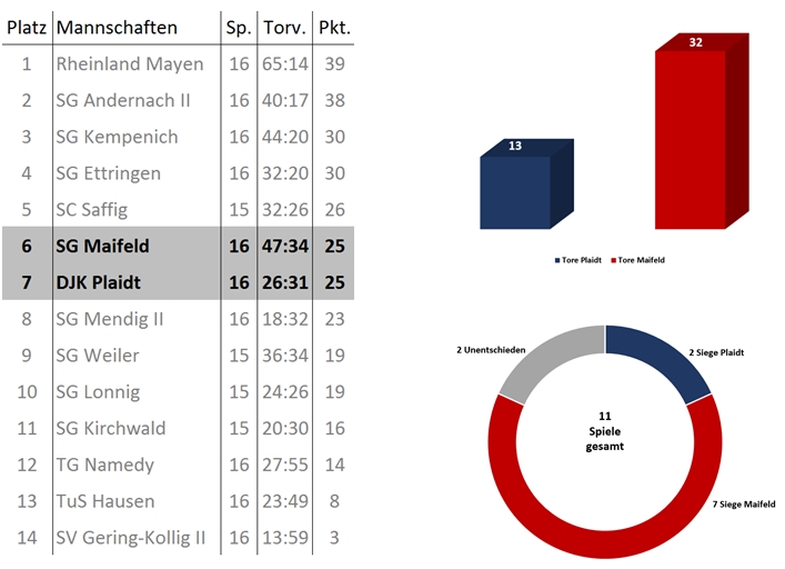 Der direkte Vergleich beider Mannschaften spricht eine klare Sprache. Die Maifelder konnten sieben der letzten 11 Begegnungen für sich entscheiden. Lediglich zwei Siege fuhr das Team aus Plaidt ein. Der letzte Sieg datiert demnach vom 13.04.2013, als die Plaidter Adler zu Hause am Pommerhof mit 1:0 gewannen (Torschütze damals: Jens Anheier). Das Torverhältnis von 13:32 aus Sicht der Plaidter ist ebenfalls deutlich. Das Hinspiel endete allerdings 1:1-Unentschieden, immerhin ein kleiner Hoffnungsschimmer für die Adler.