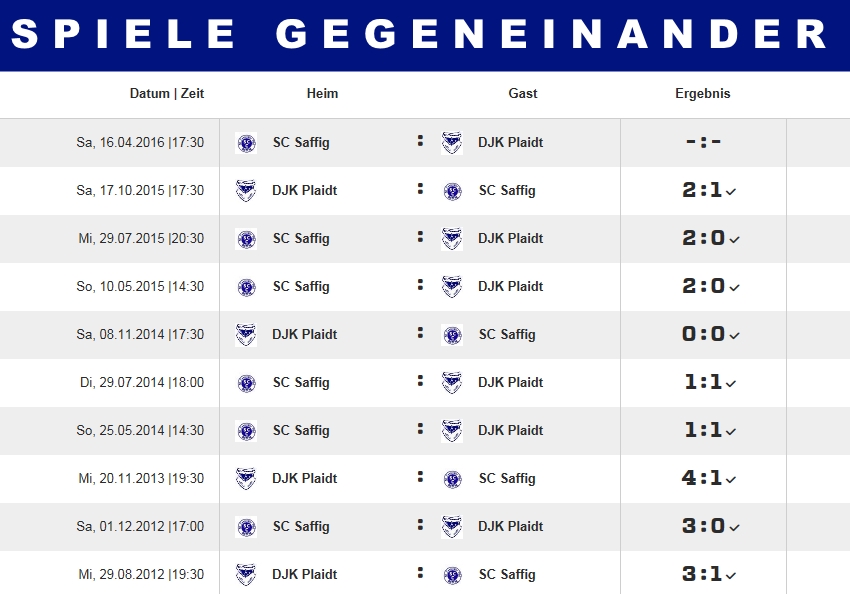 HINSPIEL: Das Hinspiel am 17.10.2015 konnten die Plaidter mit 2:1 am Pommerhof für sich entscheiden. Die Rhein-Zeitung schrieb am 19.10.2015: „DJK Plaidt gewinnt das zerfahrene Derby gegen Saffig“ Plaidt. In einem sehr zerfahrenen Derby triumphierte die heimische DJK am Ende knapp, aber verdient mit 2:1. Kopfballtore von Dominik Mürtz (8.) und Tobias Fahl (43.) sicherten den Plaidtern eine beruhigende Halbzeitführung, ansonsten waren gute Torchancen eher Mangelware. Die Concordia aus Saffig konnte erst in der Schlussviertelstunde gefährlicher werden, mehr als der Anschlusstreffer durch Tobias Schmitz (83.) sprang dabei aber nicht heraus. „Unsere taktische Ausrichtung hat nicht gegriffen, deswegen nehme ich die Niederlage voll und ganz auf meine Kappe“, meinte SCC-Coach Jürgen Kossmann. Plaidts Trainer Andreas Samson frohlockte: „Wir haben diszipliniert verteidigt und uns deshalb den Derbysieg verdient.“