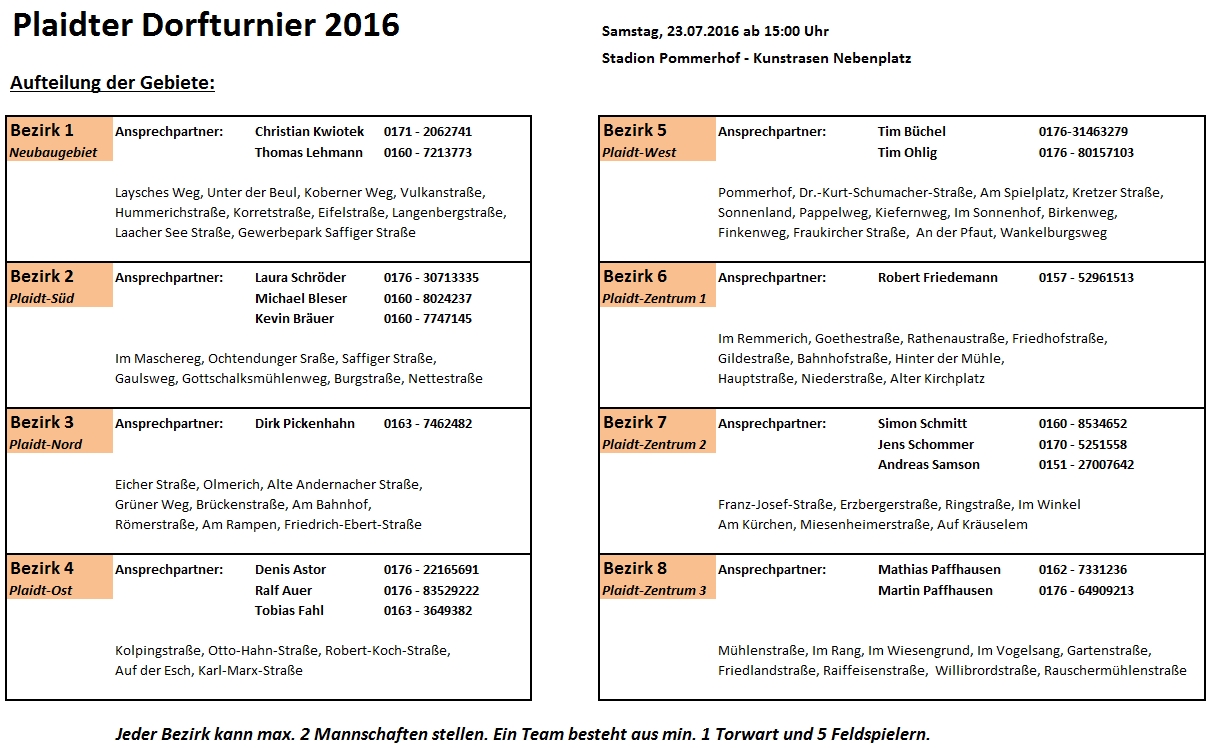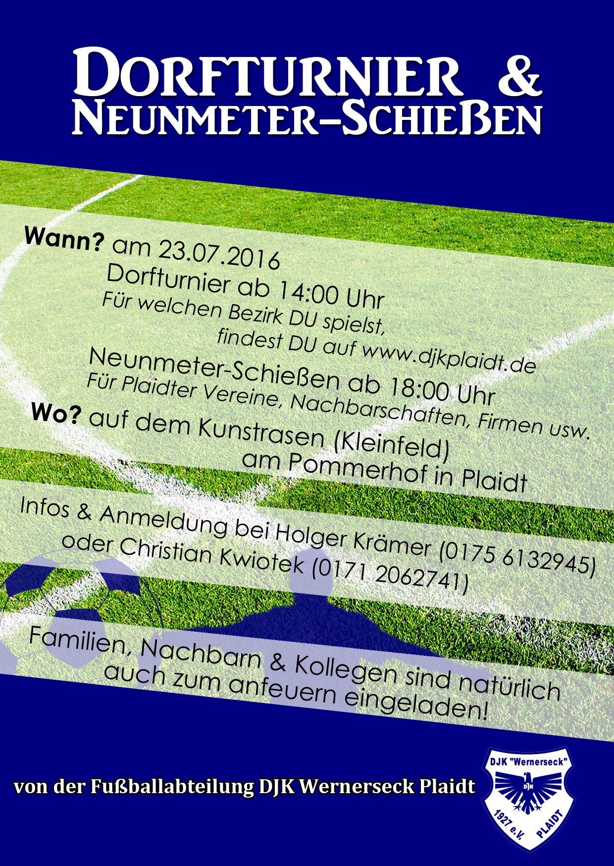 Die Fußballabteilung der DJK Wernerseck Plaidt richtet, im Rahmen ihrer Sportwoche, am 23.07.2016 ein Fußball-Event für alle Plaidter Bürger aus. Die Veranstaltung wird auf dem neuen Kunstrasenplatz (Kleinfeld) am Pommerhof ausgerichtet. Ab 14:00 Uhr ist ein Straßenturnier geplant, bei dem acht Plaidter Bezirke gegeneinander antreten werden. Die Einteilung der Bezirke kann hier eingesehen werden: