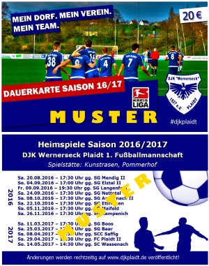 Saison 2016/2017 erhältlich. Zum Preis von 10 Spielen können damit 13 Heimspiele der Adler-Ersten Live am Plaidter Pommerhof verfolgt werden. Zu erwerben gibt es die Dauerkarte an allen bekannten Vorverkaufsstellen sowie beim Vorstand der DJK Plaidt Fußballabteilung.