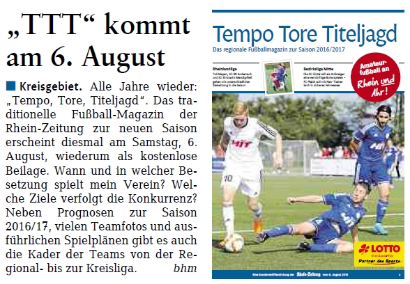 Kreisgebiet. Alle Jahre wieder: „Tempo, Tore, Titeljagd“. Das traditionelle Fußball-Magazin der Rhein-Zeitung zur neuen Saison erscheint diesmal am Samstag, 6. August, wiederum als kostenlose Beilage. Wann und in welcher Besetzung spielt mein Verein? Welche Ziele verfolgt die Konkurrenz? Neben Prognosen zur Saison 2016/17, vielen Teamfotos und ausführlichen Spielplänen gibt es auch die Kader der Teams von der Regional bis zur Kreisliga. Bhm (aus Rhein-Zeitung vom 04.08.2016)