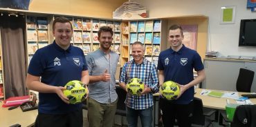 Foto: Geschäftsführer Günther Schönborn (3. v.l.) überreicht persönlich die neuen Spielbälle an DJK-Trainer Andreas Samson (2. v.l.) und sein Team. Reisebüro „Auszeit“ unterstützt die Plaidter Adler Die erste Fußballmannschaft der DJK